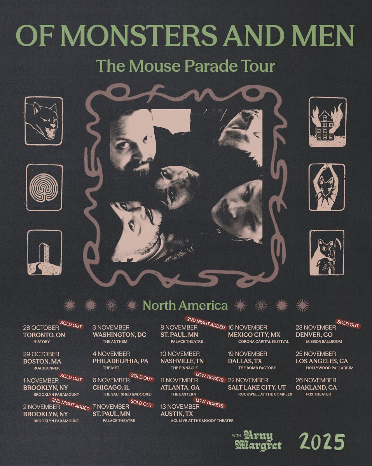 Across the many eras of this space, the gilded statues of birds, flowers, and figures have stood as enduring witnesses, much like the band taking the stage that night. Over nearly 15 years and four studio albums, the group has continued to explore new themes and sonic textures while staying true to the cinematic folk-rock sound that began with their breakout single “Little Talks.” That same spirit carries through their latest album All Is Love and Pain in the Mouse Parade in songs like “Television Love” and “Dream Team” that open the new album.