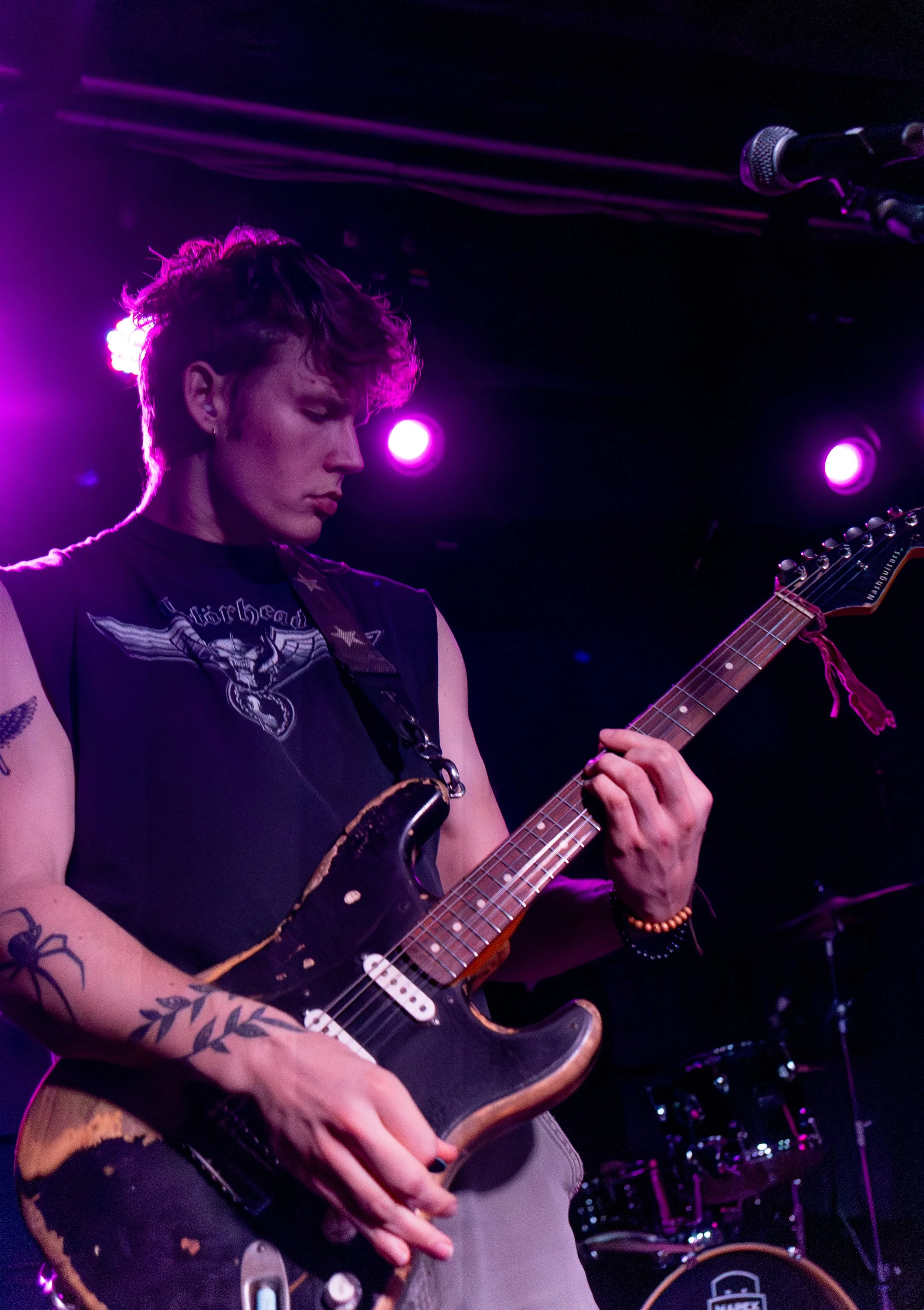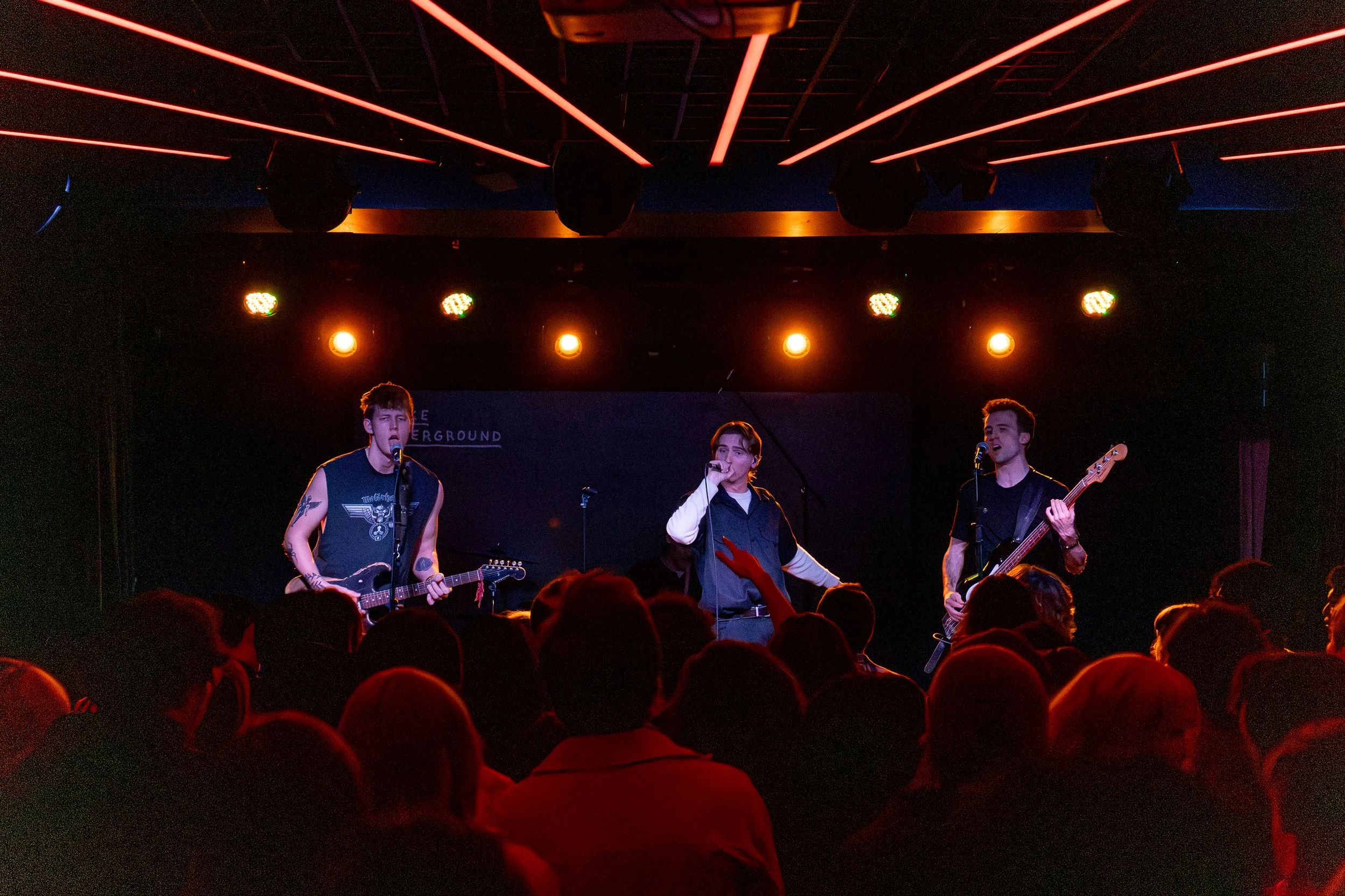 Taking the stage at Toronto’s legendary The Drake Underground, the night was unbridled chaos from the first moment lead singer Matt Purkiss looked up and smiled out at the crowd. Comprised of guitarist Mack Riddell, drummer Sam Riddell, and bassist Avery John Shoesmith, each member is introduced as “Mr. Pontiac”, a single united personality built on the grit of their garage rock origins with a bold glam edge.